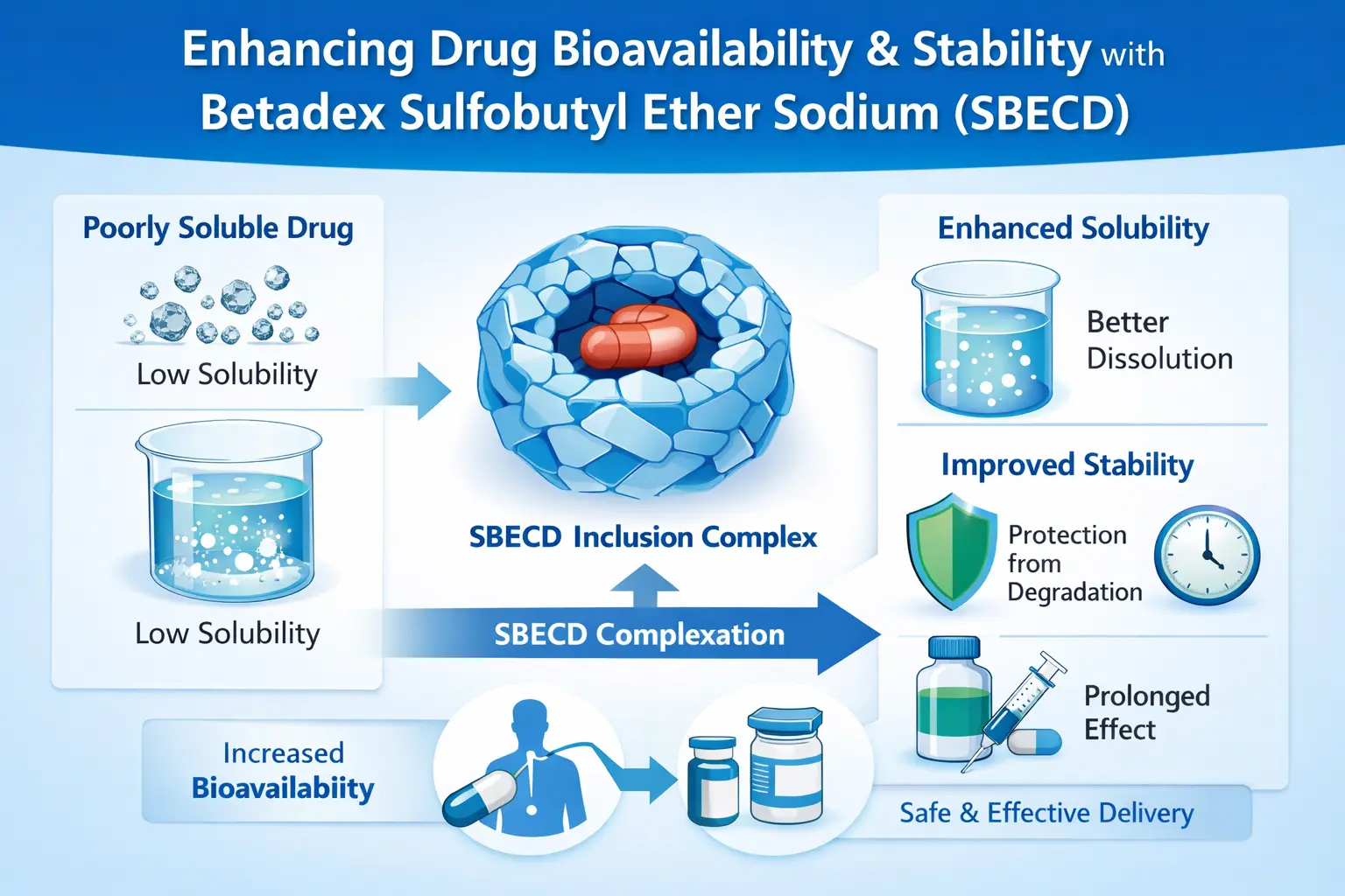 โครงสร้างทางเคมีที่เป็นเอกลักษณ์ของ SBECD ช่วยจัดการกับปัญหานี้ได้ กระดูกสันหลังของไซโคลเด็กซ์ตรินสร้างพื้นที่สำหรับโมเลกุลยาที่ไม่ชอบน้ำ และกลุ่มซัลโฟบิวทิลอีเทอร์ทำให้ยาละลายในน้ำได้ง่ายมาก เนื่องจากมีคุณสมบัติสองประการ SBECD จึงเป็นวิธีที่ดีเยี่ยมในการส่งยา