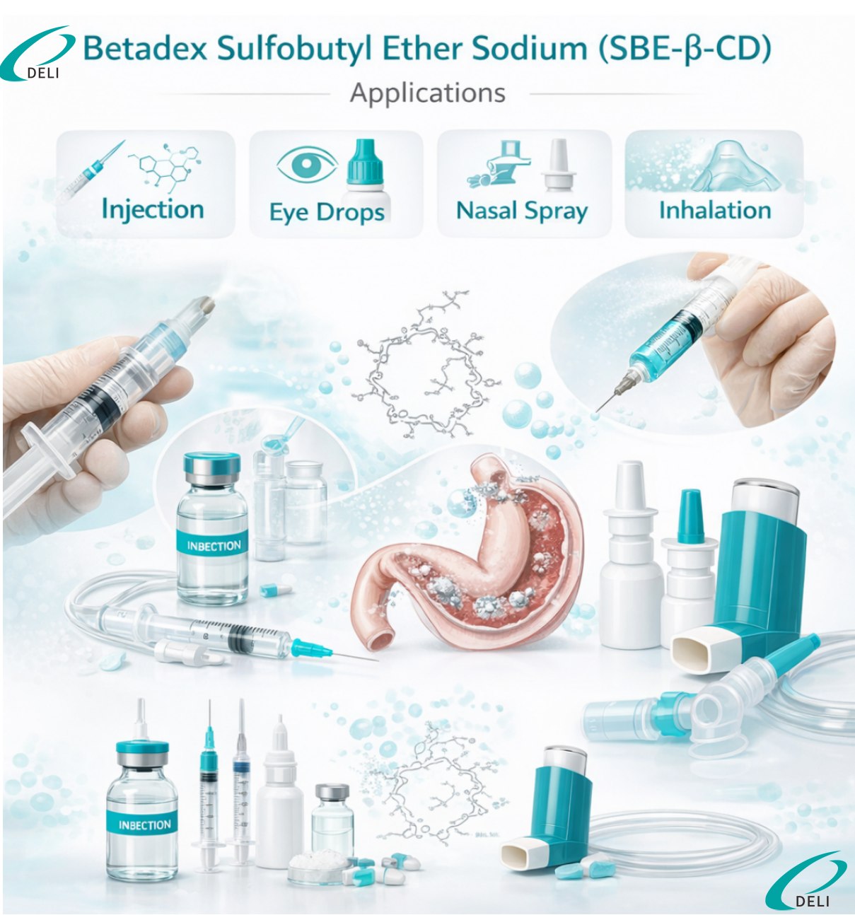 Sulfobutyl Ether Beta Cyclodextrin Sodium Injection Grade เป็นอนุพันธ์ของ anionic cyclodextrin ที่ละลายน้ำได้สูงซึ่งออกแบบมาสำหรับการใช้งานทางเภสัชกรรม ผลิตโดย Xi'an DELI Biochemical Industry Co., Ltd. ผลิตภัณฑ์นี้ถูกใช้อย่างกว้างขวางเป็นสารเพิ่มปริมาณทางเภสัชกรรมเพื่อเพิ่มความสามารถในการละลาย ความคงตัว และความปลอดภัยของส่วนผสมออกฤทธิ์ทางเภสัชกรรม (API) ที่ละลายน้ำได้ต่ำ โดยเฉพาะอย่างยิ่งในสูตรผสมแบบฉีด