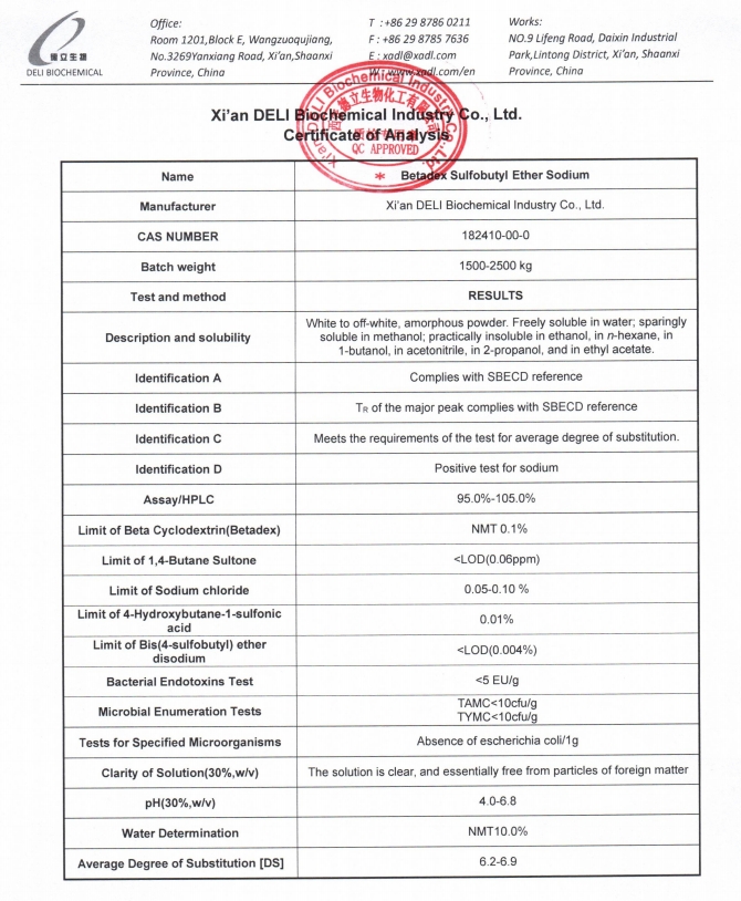 ในฐานะผู้ผลิตและซัพพลายเออร์ที่เชื่อถือได้ของเกรดการฉีดโซเดียมซัลโฟบิวทิลอีเทอร์เบต้าไซโคลเดกซ์ทริน Xi'an DELI ให้การสนับสนุนลูกค้าตั้งแต่การพัฒนาสูตรขั้นต้นไปจนถึงการผลิตเชิงพาณิชย์